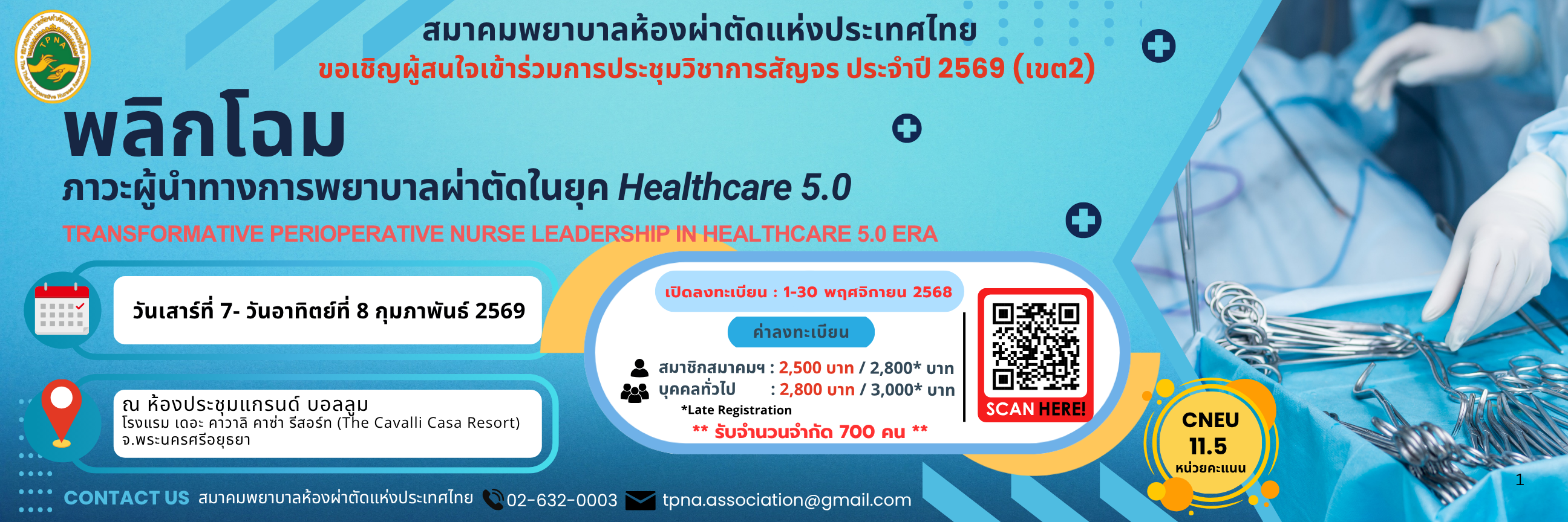 - ขอเชิญผู้สนใจเข้าร่วมการประชุมวิชาการสัญจร ประจำปี 2569 (เขต2) เรื่อง "พลิกโฉมภาวะผู้นำทางการพยาบาลผ่าตัดในยุค Healthcare 5.0"